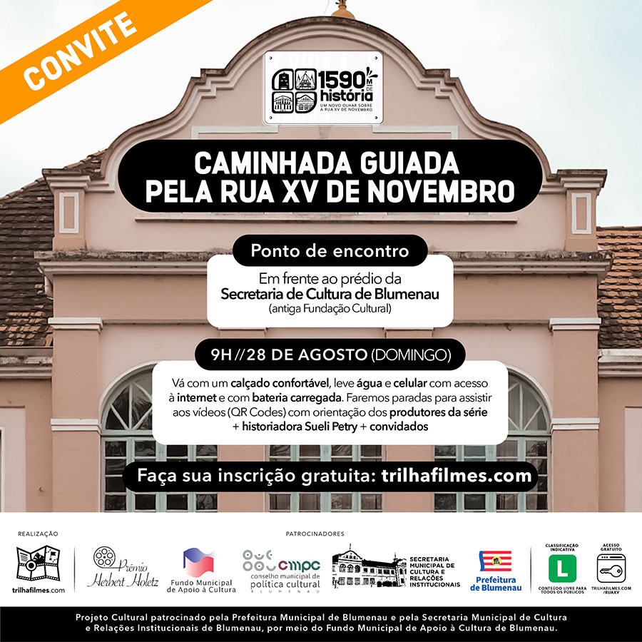 Às 9h, com caminhada guiada + acesso aos 25 episódios + personagens convidados + acompanhamento da historiadora Sueli Petry, com QR Codes instalados no percurso. Concentração/saída, às 8h45, na Secretaria Municipal de Cultura e Relações Institucionais (R. XV de Novembro, 161, Centro, Blumenau/SC). Levar: calçado confortável, água, e celular carregado e com acesso à internet.