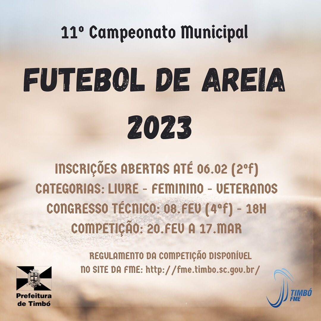 As inscrições para o 11º Campeonato Municipal de Futebol de Areia de Timbó seguem até a próxima segunda-feira, dia 06 de fevereiro. O evento abre o calendário esportivo deste ano e é promovido pela Fundação Municipal de Esportes (FME Timbó).
