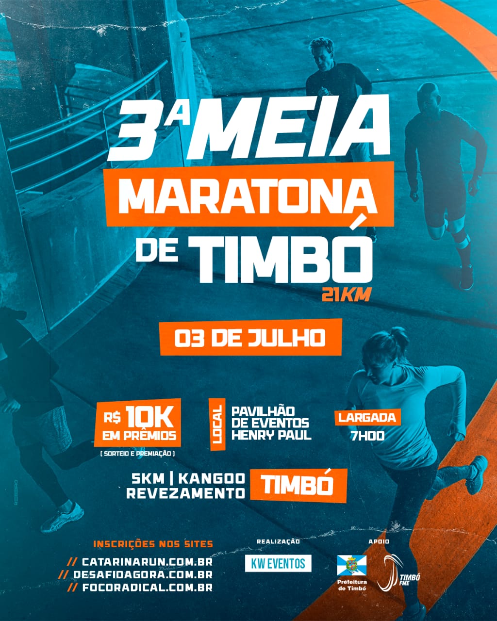 Seguem abertas até o dia 28 de junho as inscrições para a 3ª Meia Maratona de Timbó, promovida pela Prefeitura, através da Fundação Municipal de Esportes (FME). O evento acontece dia 03 de julho, no Pavilhão de Eventos Henry Paul.
