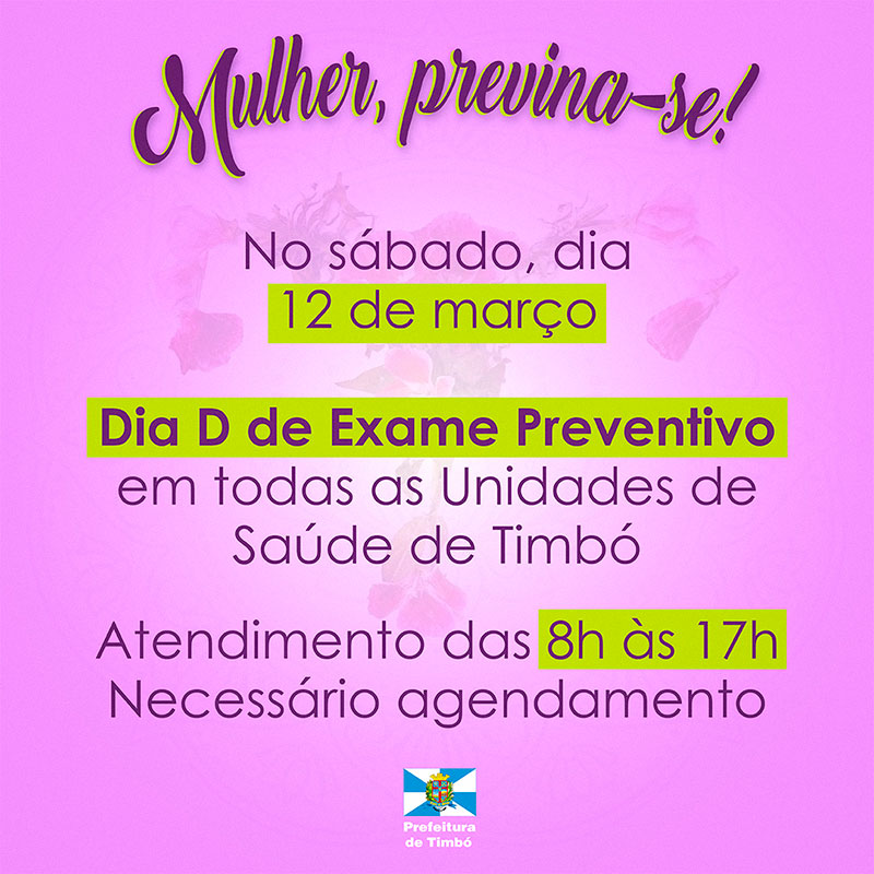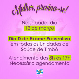 Por isso, para contemplar as mulheres que não podem ir durante a semana, no sábado, dia 12 de março, todas as Unidades de Saúde de Timbó estarão atendendo das 8h às 17h, somente exames preventivos. Os atendimentos serão através de agendamento. Entre em contato com a sua Unidade de Saúde.