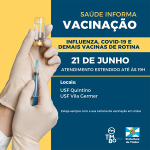 A Secretaria de Saúde de Timbó informa que nesta quarta-feira, dia 21 de junho, as Unidades de Saúde dos bairros Vila Germer e Quintino terão horário de atendimento estendido para aplicação das vacinas da Influenza, Covid-19 e demais vacinas de rotina, para todas as idades.