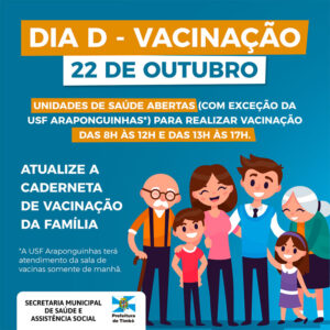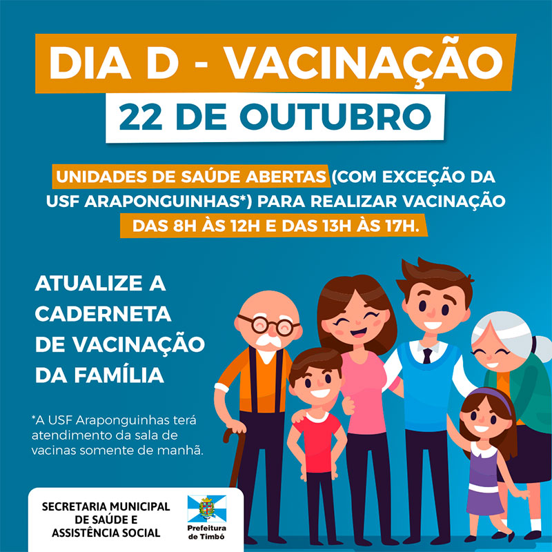 Além disso, as salas de vacinação das Unidades também estarão abertas. Com exceção da USF do Bairro Araponguinhas, que terá atendimento na sala de vacinação somente no período da manhã.