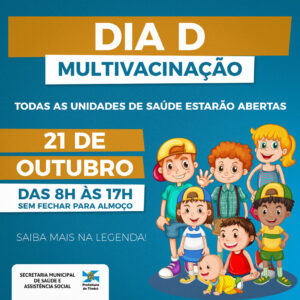A Campanha de Multivacinação iniciou nesta segunda-feira, dia 16, e segue até dia 27 de outubro. O objetivo da Campanha é atualizar as vacinas de crianças e adolescentes de 0 a 14 anos e fornecer a declaração de vacina para matrícula e rematrícula nas unidades de ensino.
