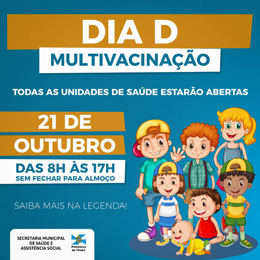 Neste sábado, dia 21 de outubro, todas as Unidades de Saúde de Timbó estarão abertas para o Dia D da Campanha de Multivacinação. O funcionamento será das 8h às 17h (sem fechar para o almoço) aplicando vacinas para toda a população.