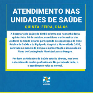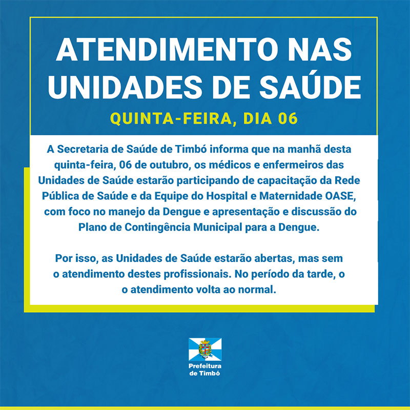 A Secretaria de Saúde de Timbó informa que na manhã desta quinta-feira, dia 06 de outubro, os médicos e enfermeiros das Unidades de Saúde estarão participando de capacitação da Rede Pública de Saúde e da Equipe do Hospital e Maternidade OASE, com foco no manejo da Dengue e apresentação e discussão do Plano de Contingência Municipal para a Dengue.