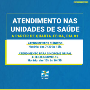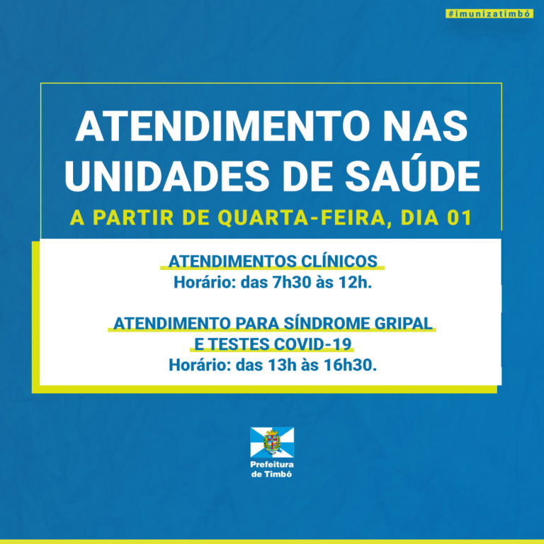 A Secretaria de Saúde de Timbó informa que a partir desta quarta-feira, dia 01 de junho, terá uma mudança no horário de atendimento nas Unidades de Saúde. A mudança acontece devido ao aumento no número de casos de Covid-19.