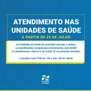 A Secretaria de Saúde de Timbó informa que a partir desta segunda-feira, 25 de julho, as Unidades de Saúde do município passam a realizar os atendimentos à população normalmente, sem dividir os atendimentos clínicos e de Covid-19 em períodos distintos.