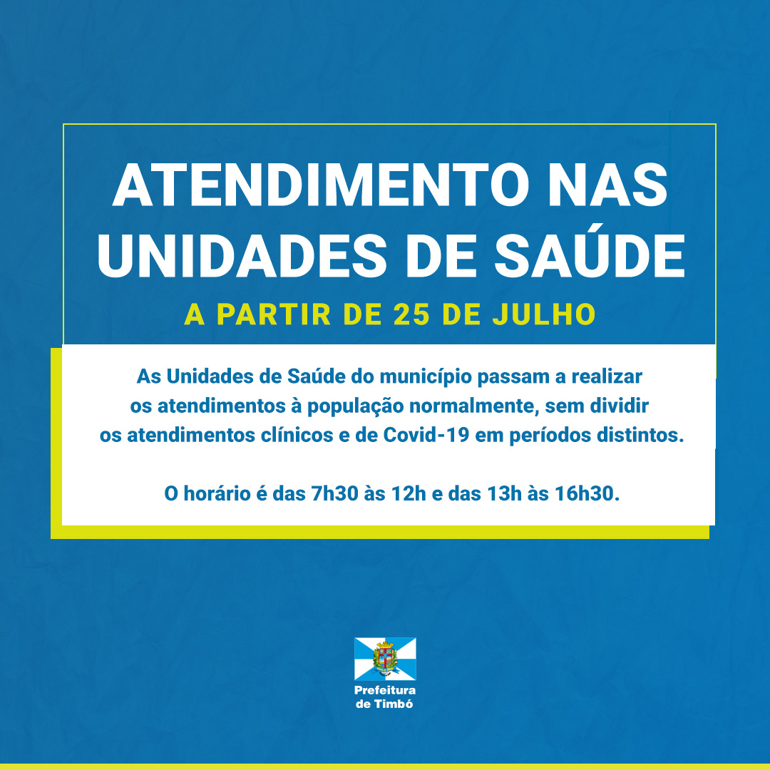A Secretaria de Saúde de Timbó informa que a partir desta segunda-feira, 25 de julho, as Unidades de Saúde do município passam a realizar os atendimentos à população normalmente, sem dividir os atendimentos clínicos e de Covid-19 em períodos distintos.