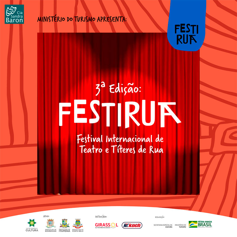 A terceira edição do Festival Internacional de Teatro e Títeres de Rua (Festirua), apresenta 30 companhias selecionadas, sendo seis internacionais e 24 nacionais de sete estados brasileiros. O Festival oferece, gratuitamente, 25 espetáculos de teatro de animação e três tutorias de como fazer teatro de bonecos. Além de toda essa programação on-line, que fica disponível no site www.festirua.com.br, dois espetáculos se apresentarão de forma presencial para a comunidade: dia 10/10, às 16h, no Balaio Cultural e 12/10, às 16h, na 9ª Festa das Crianças, ambas em Bombinhas; dia 15/10, às 9h30, no Palco das Artes, em Porto Belo; dia 15/10, às 15h30, no Espaço Cultural Nelson Santos (antigo mercado público), em Itapema.