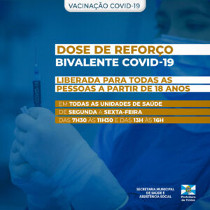 A Secretaria de Saúde de Timbó, conforme orientação do Ministério da Saúde, informa que todas as pessoas a partir de 18 anos estão liberadas para tomar a dose de reforço bivalente da vacina contra Covid-19.