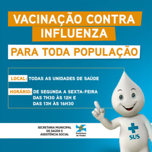 A Secretaria de Saúde de Timbó informa que a vacina contra a Influenza está liberada para toda a população a partir dos 6 meses de idade.