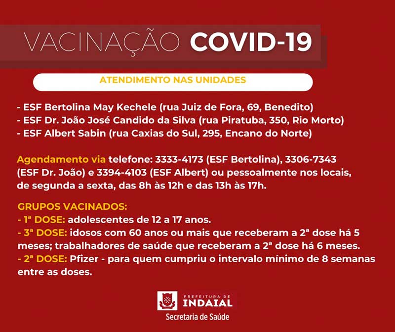A Secretaria de Saúde informa que a partir desta quarta-feira, 10 de novembro, a vacinação contra a Covid-19 passa a ser realizada também na Unidade de Saúde Albert Sabin, localizada na rua Caxias do Sul, 295, Encano do Norte. A imunização já acontece na ESF Bertolina May Kechele, localizada na rua Juiz de Fora, 69, bairro Benedito, e ESF Dr. João José Candido da Silva, situada na rua Piratuba, 350, Rio Morto, além da Central de Vacinação no Parque Municipal Jorge Hardt.