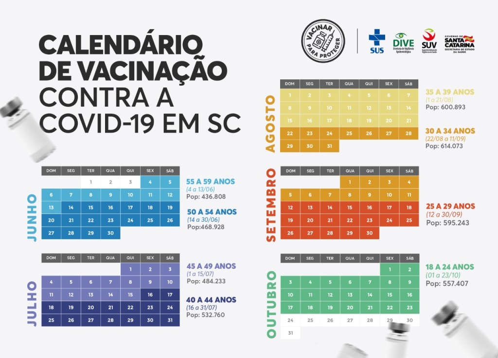 O Governo de Santa Catarina vai vacinar toda a população catarinense com 18 anos ou mais até o dia 23 de outubro de 2021. A informação está na projeção do Calendário de Vacinação contra a Covid-19, que traz detalhes de como será a imunização por faixa etária, divulgado nesta terça-feira, 8, pela Secretaria de Estado da Saúde. De acordo com o Calendário, serão oito etapas. A primeira delas, de pessoas com idade entre 59 e 55 anos, começou no dia 4 de junho, com a primeira dose.