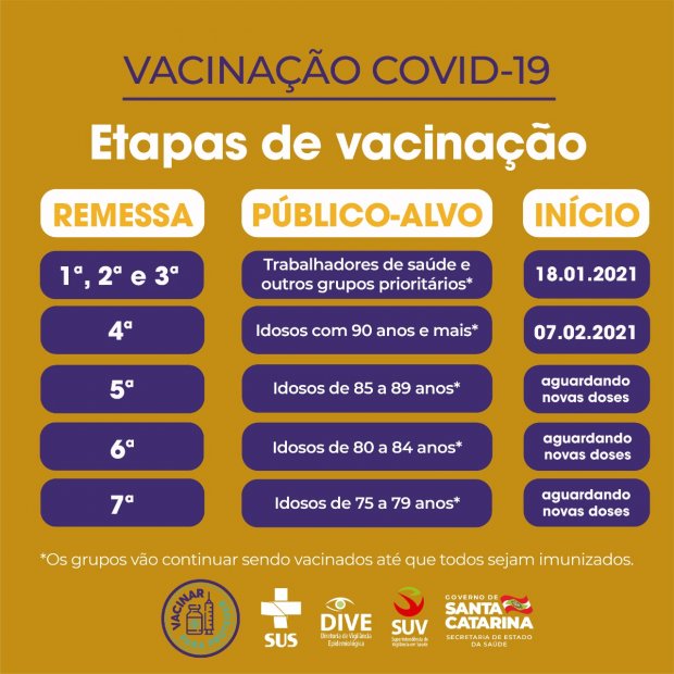 A distribuição deste novo lote de vacina será realizada na segunda-feira, 8. As doses vão para as regionais de saúde da Grande Florianópolis, Tubarão, Itajaí, Blumenau, Joinville, Jaraguá do Sul, Videira, Joaçaba, Concórdia, Xanxerê, Chapecó, Criciúma, Araranguá, Mafra, Lages, Rio do Sul e São Miguel do Oeste. E, mais uma vez, vai contar com o apoio das forças de segurança para que as vacinas cheguem com maior agilidade a todos os 295 municípios catarinenses.