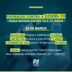 A partir de amanhã, inicia a aplicação em novos grupos. O local permanece sendo o Salão da Igreja Matriz Santa Terezinha, localizada na Rua Germano Brandes Senior, número 397, no Centro. Importante reforçar que todos os protocolos de segurança e prevenção estão sendo seguidos, como distanciamento, uso de máscara e álcool em gel à disposição.