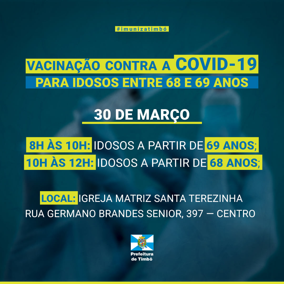 A Prefeitura de Timbó, através da Secretaria de Saúde, informa que 650 doses de vacina contra a Covid-19 chegaram na última sexta-feira, 26 de março, e serão aplicadas amanhã, 30 de março, em idosos que têm entre 68 e 69 anos (ou mais).