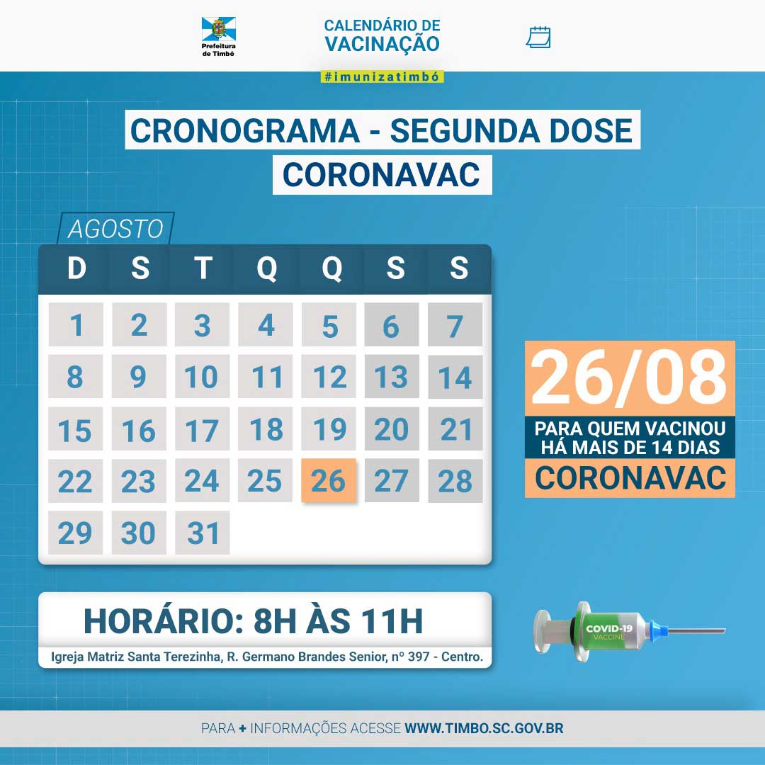 A Secretaria de Saúde informa que nesta quinta-feira, dia 26, irá abrir vacinação de segunda dose da vacina Coronavac, para aqueles que ainda não compareceram para garantir a imunização completa.