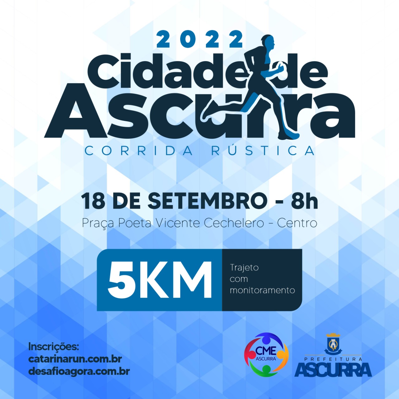 A edição 2022 da corrida rústica Cidade de Ascurra acontece no dia 18 de setembro, a partir das 08h, com concentração na Praça Poeta Vicente Cechelero, no centro.