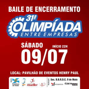 A 31ª Olimpíada Entre Empresas de Timbó – Troféu AA Mueller 40 anos caminha para sua última semana e com ela vem o tradicional Baile de Encerramento da Olimpíada, que acontece no sábado, dia 09 de julho, no Pavilhão de Eventos Henry Paul.