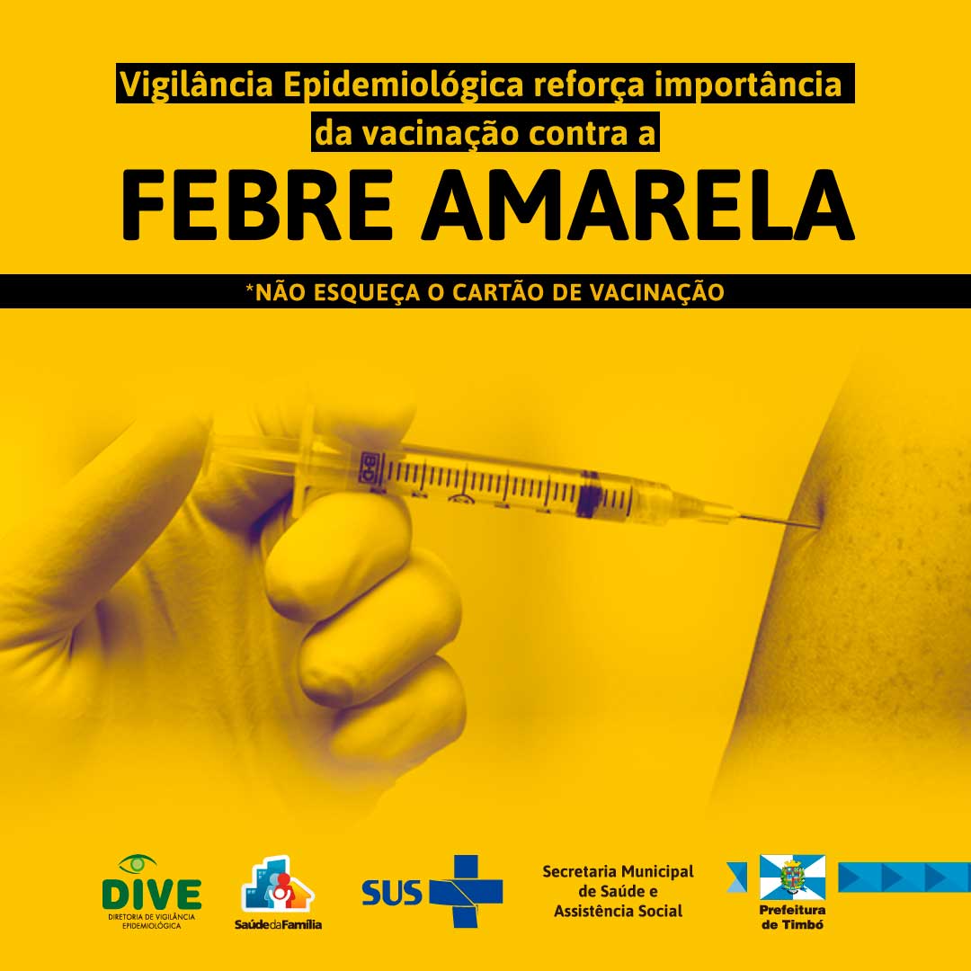 Nos meses de dezembro a maio, a circulação do vírus da Febre Amarela é maior na nossa região. Somente neste mês, o município de Timbó já notificou um caso suspeito de Febre Amarela em humano, de um morador que não estava vacinado. No momento, ele permanece internado no Hospital Nereu Ramos, em Florianópolis.