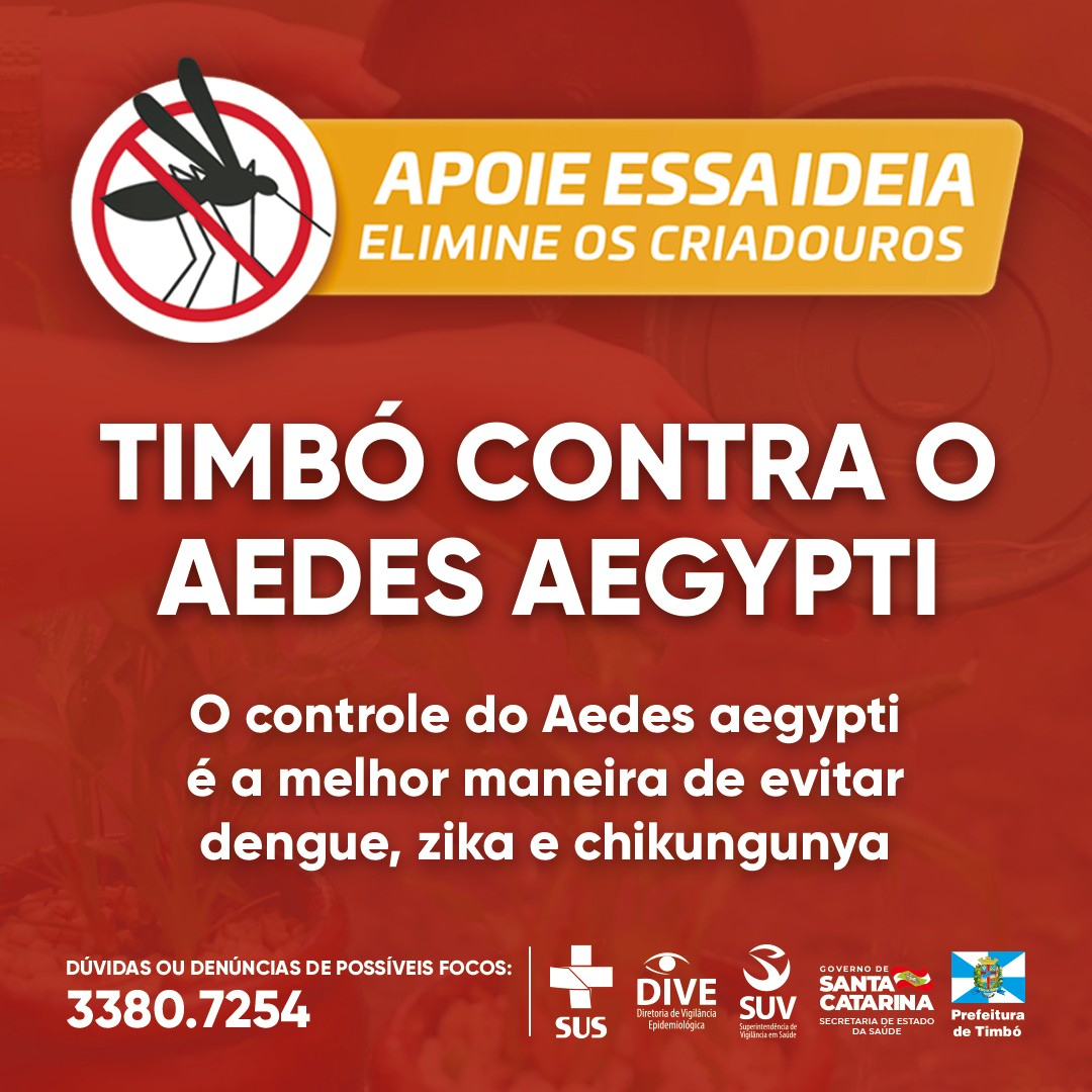De acordo com informações da Vigilância Sanitária de Timbó, somente neste ano já foram registrados no município 51 focos do mosquito Aedes aegypti, transmissor da dengue, chikungunya e zíka vírus. Foram dois focos no Bairro Pomeranos, 13 focos no Bairro das Capitais, 13 focos no Bairro dos Estados, dois focos no Bairro das Nações, 11 focos no Bairro Centro, cinco focos no Bairro Fritz Lorenz, um foco no bairro Quintino e quatro focos no Bairro Imigrantes.
