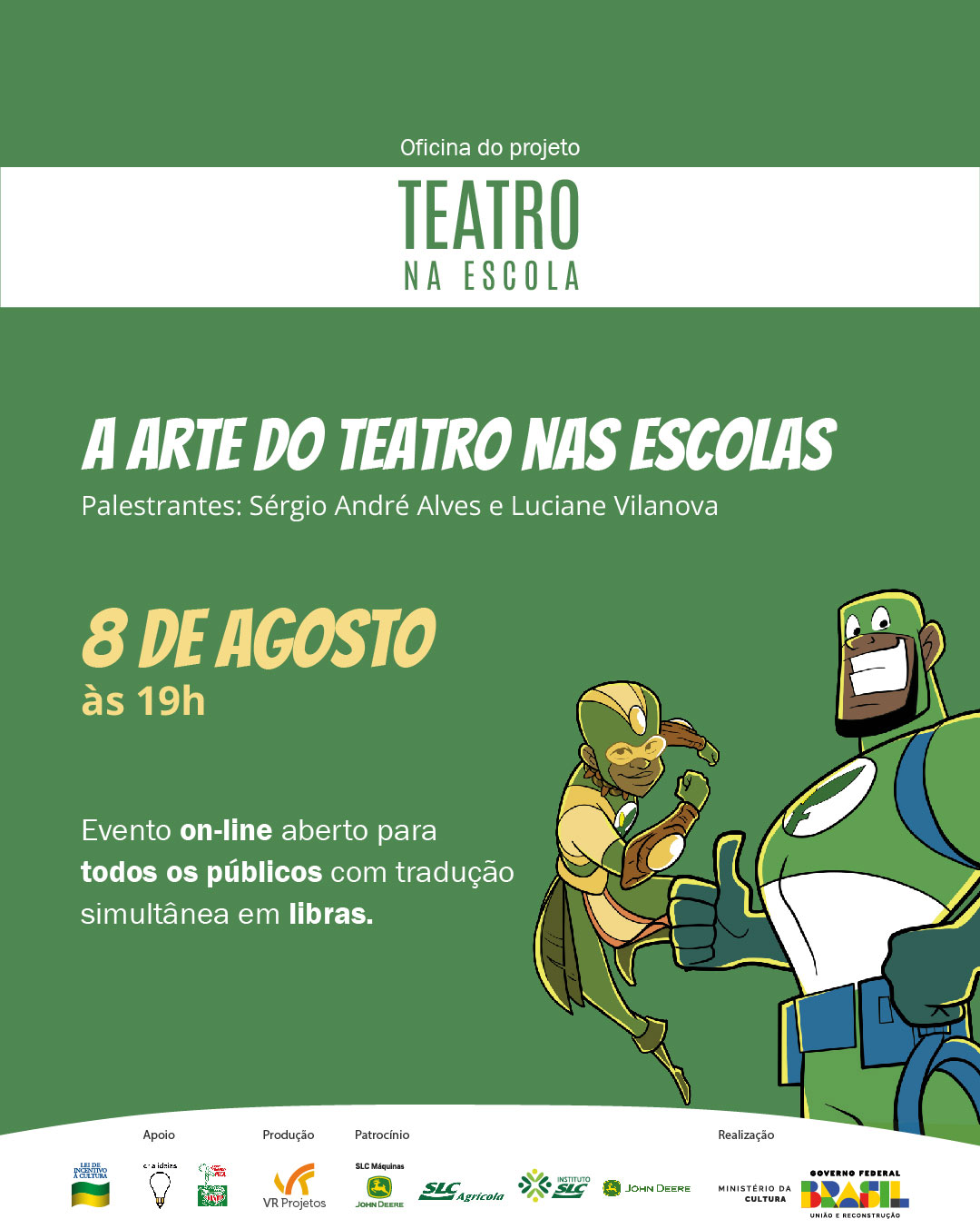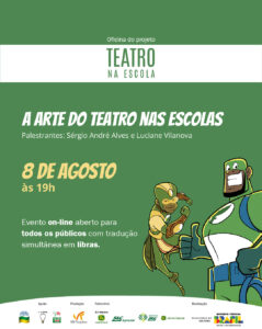 Assim, para incentivar e tornar práticas como essa acessíveis e viáveis nas escolas públicas do país, fazendo com que mais crianças tenham acesso ao teatro, será realizada no dia 8 de agosto, às 19h, a oficina “A Arte do Teatro nas Escolas”. A transmissão, ao vivo, acontecerá por meio do YouTube da VR Projetos (@vrprojetos) de forma online e gratuita, contando com tradução simultânea em libras. As inscrições podem ser realizadas pelo link forms.gle/EycgvJ7tyKu49gxL7.